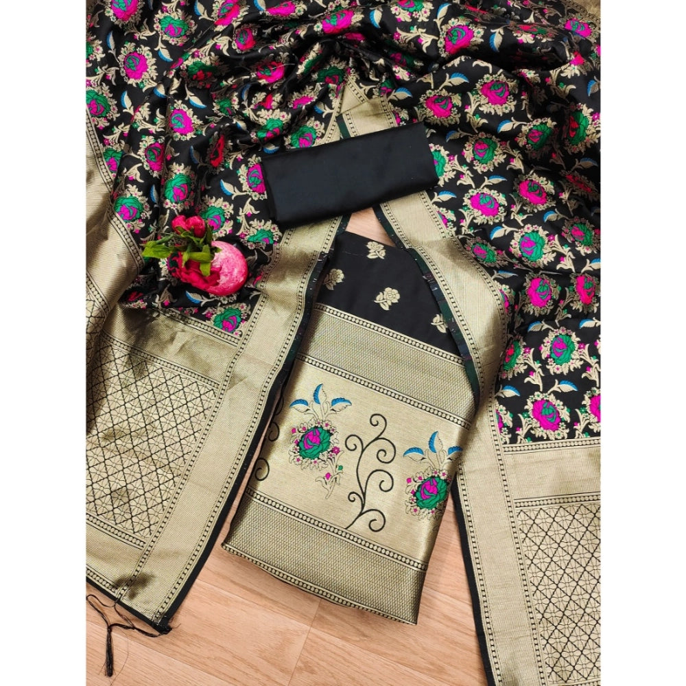 Generic Women's Banarasi Silk Printed Unstitched Salwar Suit Material With Dupatta (Black, 3Mtrs)