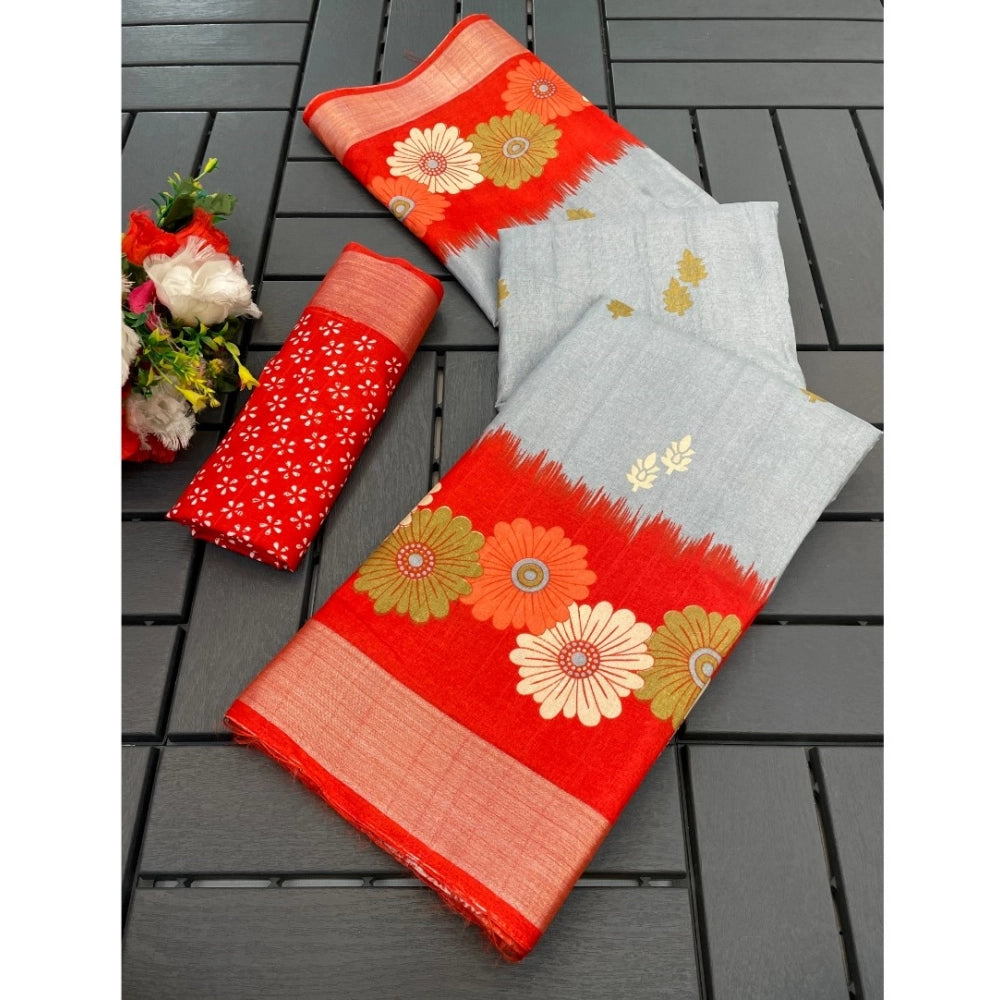 Generic Women's Cotton Blend Printed Saree With Unstitched Blouse (Grey, 5-5 Mtrs)