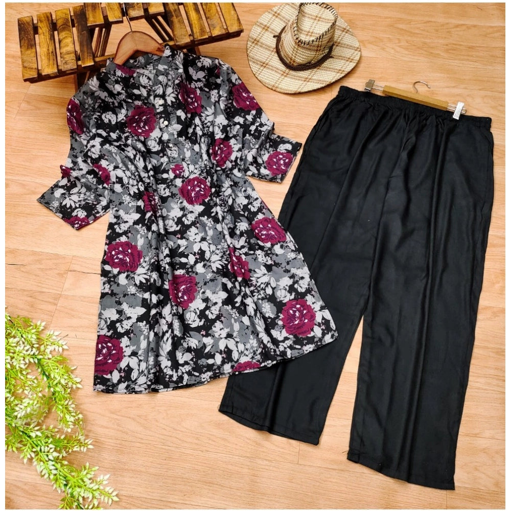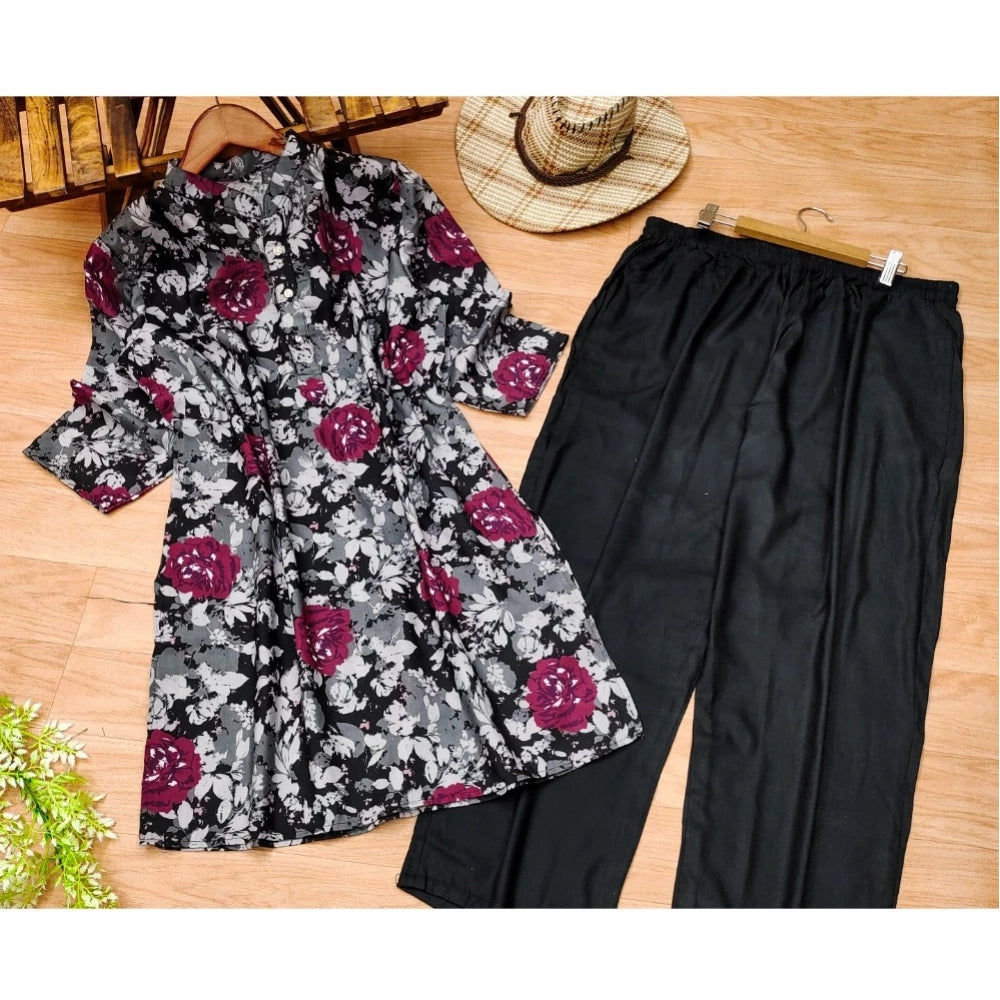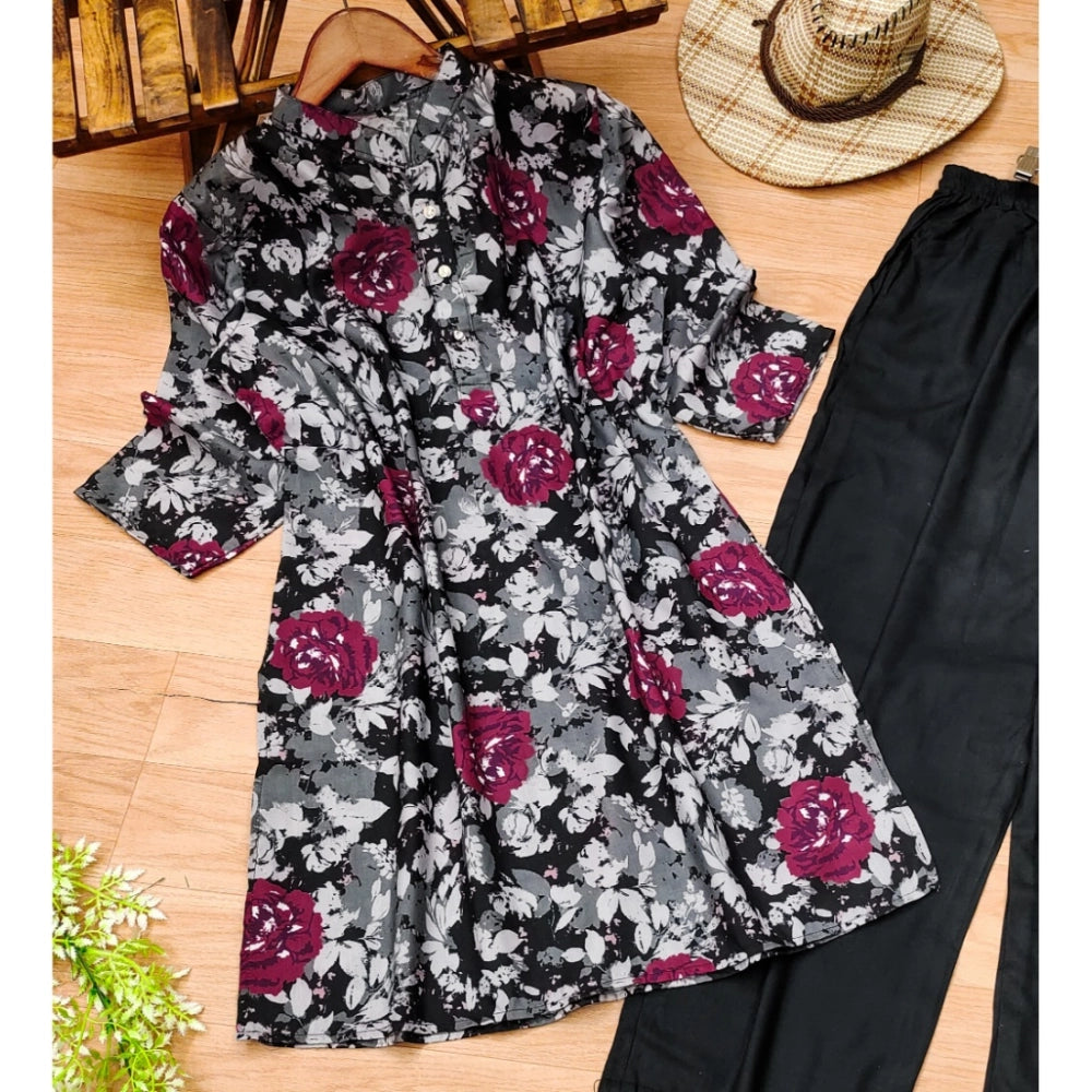Color: Grey, Material: Muslin Pattern: Printed, Neck Type: Mandarin Collar Sleeve Type: 3-4th Sleeve, Type: Kurti With Pant Set