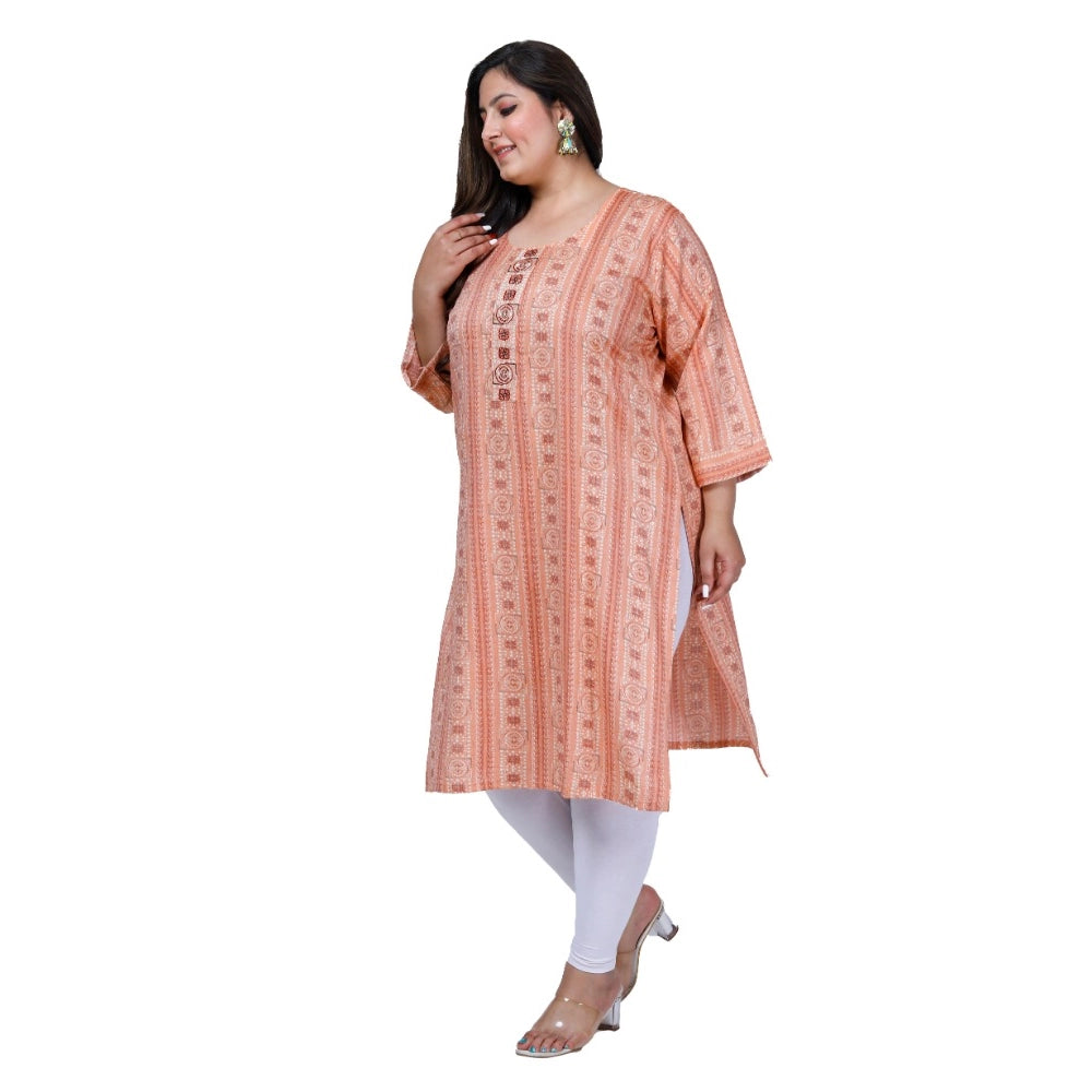 Women's Office wear Golden Foil Capsule Straight Kurti • Color: Orange, • Material: Capsule • Neck Type: Round, • Neck Style: Neck Embroidery • Kurti Style: Straight, • Slit Type: Side Slit, • Side Type: Open, • Sleeve Type: 3/4th Sleeve • Disclaimer: The color of actual product may vary slightly from the images provided due to photographic lighting conditions and difference in screen resolutions.