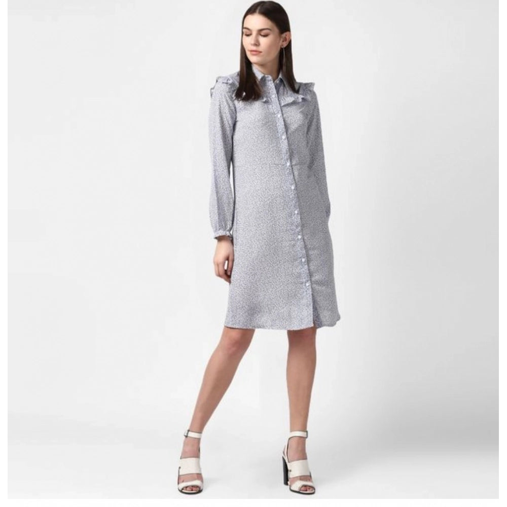 Generic Women's Polyester Floral Collar Neck Long Sleeves Dress (Blue)