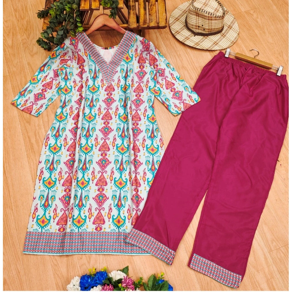 Color: Pink, Material: Rayon Krugar Pattern: Printed, Neck Type: V Neck Sleeve Type: 3-4th Sleeve, Type: Kurti With Pant Set